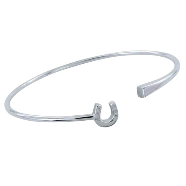 • In stunning high shine sterling silver, a classic horseshoe set with cubic zirconia stones sits at one end of the cuff, with the band encircling the wrist and finishing with a 'nail style' at the other end.